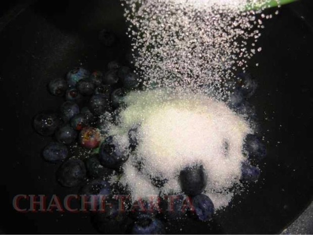 Empieza por preparar la mermelada, cocinando los arándanos junto con el azúcar hasta que éstos se deshagan y coja consistencia, si no te apetece prepararla puedes usar mermelada comercial.