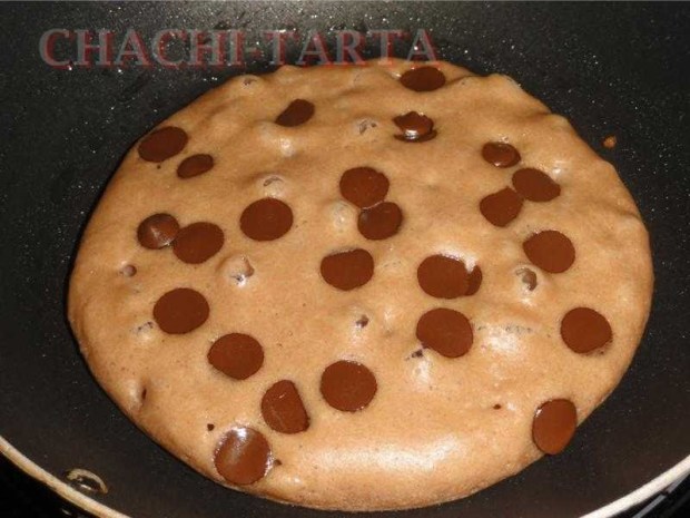 Salpica con aceite una sartén pequeña (del tamaño que desees los pancakes) y cuando esté caliente vierte 2 o 3 cucharadas de la mezcla por toda la superficie; rápidamente reparte e incrusta pepitas de chocolate por encima y cocina durante unos 5 minutos, verás como forma grumitos a medida se va haciendo, cuando deje de hacerlos da la vuelta a la tortita para que se cocine de ambos lados.