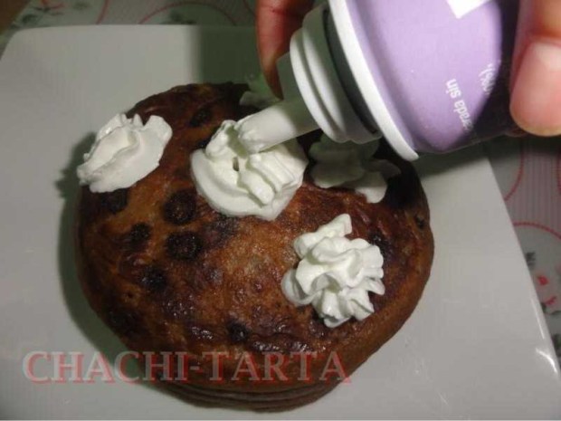 Consérvalos envueltos en un paño de cocina para que no se enfríen a medida preparas el resto de pancakes hasta acabar la mezcla. Al momento de servir coloca un poco de nata montada (marca Friocrem es sin gluten) y sirope de chocolate (marca HACENDADO es sin gluten) para decorar, el toque de nata les viene de maravilla pues además de aportarle humedad hace un contraste fenomenal.