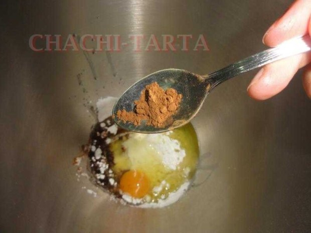 Agrega el huevo a la mezcla de harinas, además de incorporar el aceite, el azúcar moreno y la canela en polvo, la cantidad de canela queda al gusto de cada quien, en principio puse 1/2 cucharadita pero al final he acabado poniendo 1 cucharadita entera.