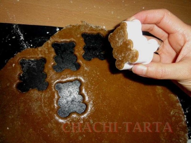 Una vez fría, extiende la masa sobre una hoja de papel vegetal o alfombrilla de silicona con ayuda de un rodillo hasta que tengan un grosor de no menos 1/2 centímetro; recorta las galletas con la forma del cortador deseado (en mi caso ositos) y retira los bordes dejando separación entre ellas para evitar que se nos queden pegadas.