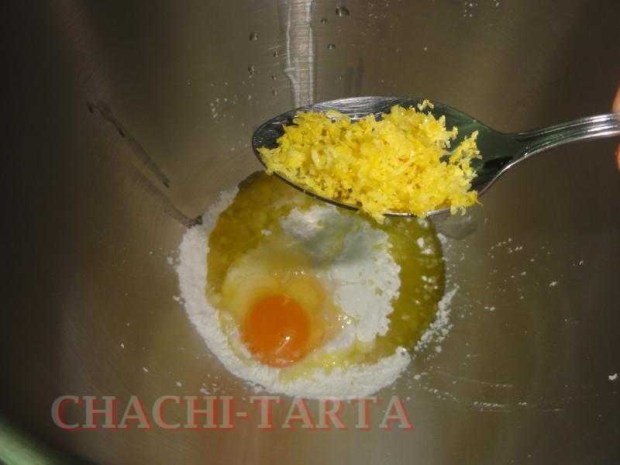 Mezcla todos los ingredientes secos tamizados: las harinas y el azúcar glacé, añade el huevo, el aceite y la ralladura de limón y mezcla hasta que todo quede integrado y se forme una masa densa, puedes amasar ya sea a mano o con ayuda de robot de cocina.