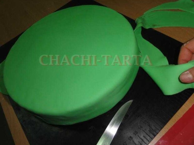 Una vez eliminados los excesos de nata o glaseado, puedes recubrir la tarta con el fondant, en mi caso de la marca KELMY (sin gluten), que he coloreado en verde utilizando colorantes comestibles Sugarflair (sin gluten).