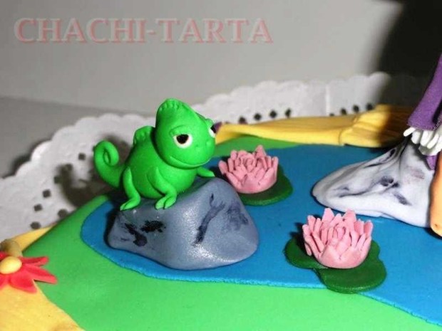 Para decorar he colocado muchas flores, un lago y algunas piedras, una de ellas en la que se encuentra sentada Rapunzel, de la cual he creado un tutorial paso a paso muy detallado de como modelarla en fondant de azúcar incluyendo a su mejor amigo Pascal, hasta ahora creo ha sido el mejor modelado que he hecho, poco a poco parece que mejoro aunque todavía queda muuuuucho por aprender.