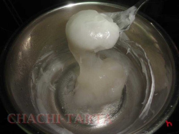 Calienta el agua y añade 3 cucharadas de almidón agrio de mandioca, he de aclarar que existen 2 tipos de almidón de mandioca: uno dulce que teóricamente vale para bizcochos y el otro agrio especial para panes; es la primera vez que lo pruebo, tardé en encontrarlo pues en el supermercado no lo encontré sino más bien en tiendas especializadas de productos importados.
