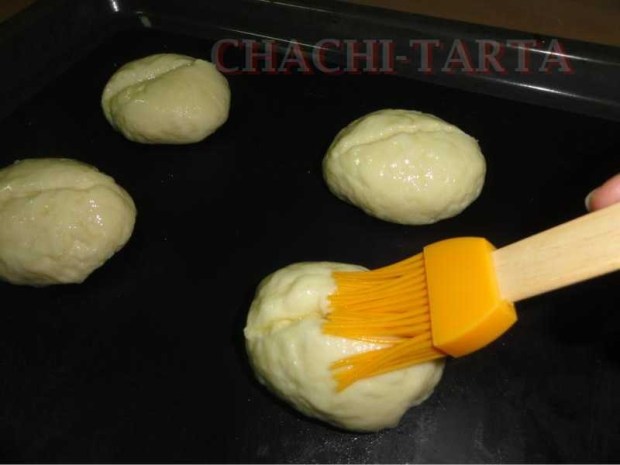 Una vez formada la masa, divide en 4 partes iguales y forma los bollos con la forma deseada, colócalos en la bandeja del horno dejando un margen de separación entre cada uno y procede a hacer un corte transversal en cada panecillo, unta la superficie con un poco de aceite y recubre con papel film, deja reposar durante al menos 1 hora en el horno cerrado y apagado.