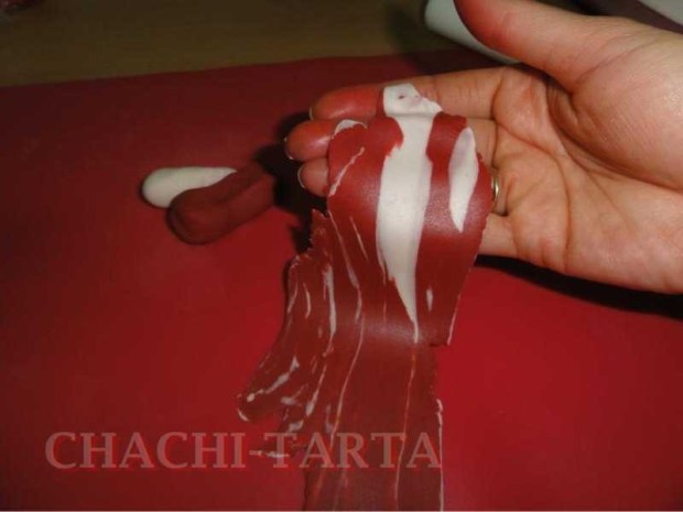 Para darle más realismo a la tarta y que se entienda lo que es, he fabricado un «falso jamón» mezclando trozos de fondant rojo-marrón y blanco, formando vetas y estirando con ayuda de un rodillo… a simple vista parece jamón de verdad 😉