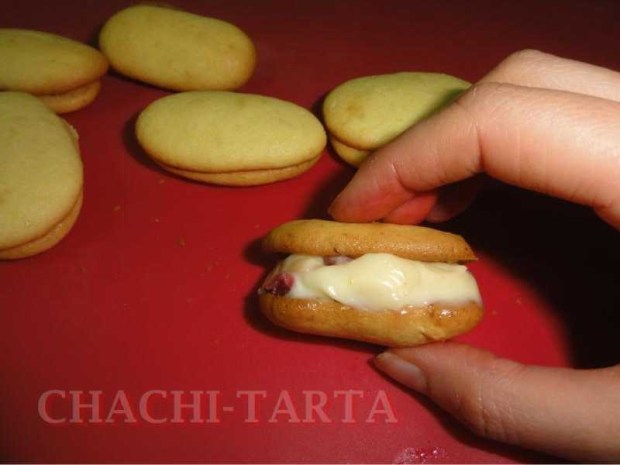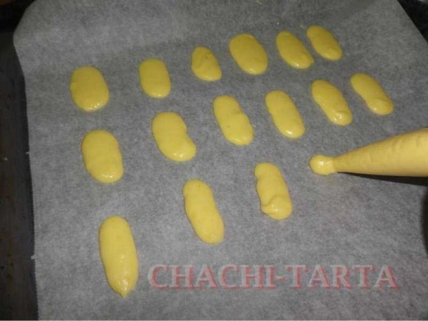 Coloca en una manga pastelera sin boquilla y dosifica pequeñas cantidades alargadas sobre la bandeja del horno, dejando margen de separación entre cada una; la idea es bastante similar a la de los whoopie pies.
