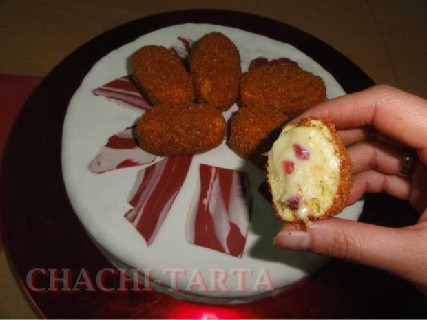 He cortado una de mis falsas croquetas para colocar una abierta, de modo tal que parezca que se escurre la bechamel, ha quedado tan realista que cuando las muerdes te imaginas que en verdad sabrán a jamón jejeje