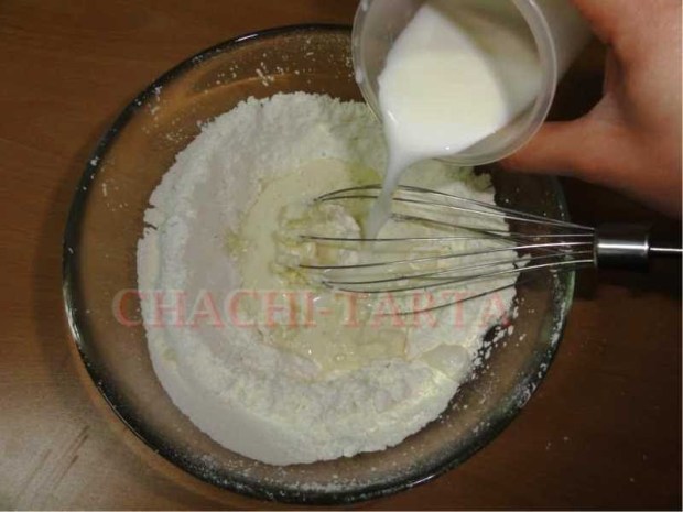 Tamiza la harina junto con la levadura (en mi case he usado de las marcas Schar Mix B y HACENDADO respectivamente, ambas sin gluten), agrega sal y la leche templada y mezcla poco a poco con ayuda de unas varillas de cocina hasta que todo se integre.