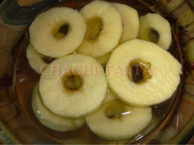 En 1/2 litro de agua escurre unas gotas de zumo de limón, pela y descorazona las manzanas cortándolas posteriormente en rebanadas con grosor aproximado de 1 cm, colócalas en el agua con limón para que no se oxiden. Normalmente para postres y preparaciones de este tipo siempre suelo usar manzanas tipo gala, son las que mejor van pues no son excesivamente ácidas ni dulces y tienen mucho mejor consistencia.