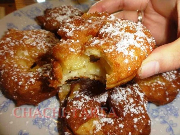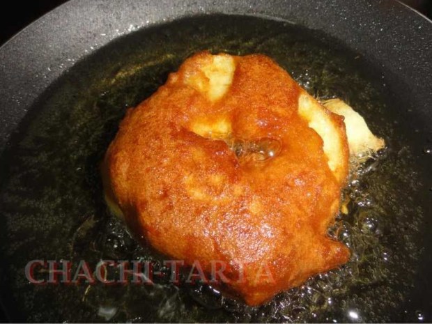 Transcurrido el tiempo de levado, una a una escurre las rebanadas de manzana, seca y sumerge en la masa para que ésta se adhiera por completo, puedes ayudarte de un tenedor para que te sea más fácil.