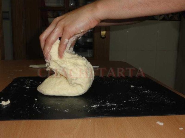 En la mesa de trabajo o encimera, amasa continuamente y sin espolvorear nada de harina, estirando y doblando la masa sobre si misma muchas veces. Verás como al principio parece que no hay manera de cogerla y se pega mucho en las manos, pero poco a poco va volviéndose mas dócil, elástica y manejable.