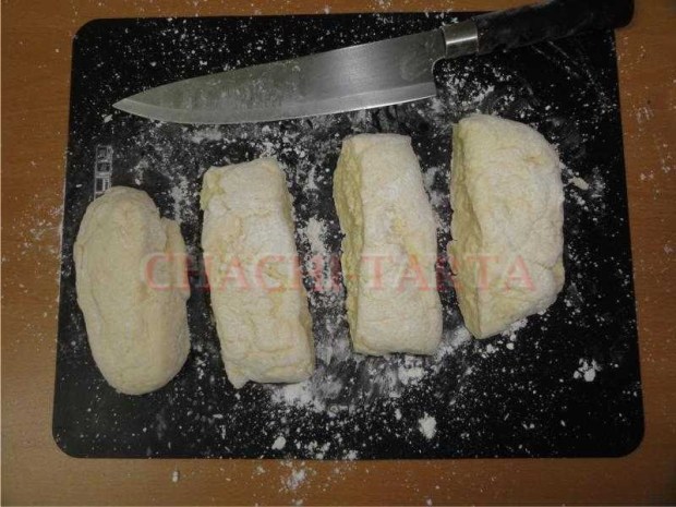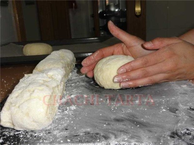 Vuelca la masa sobre la encimera y espolvorea un poco de harina, moldea una pieza alargada pero sin amasar para no bajar el efecto de la levadura. Corta 4 partes iguales con ayuda de un cuchillo bien afilado, cada pieza deberá pesar más o menos 200 gr.