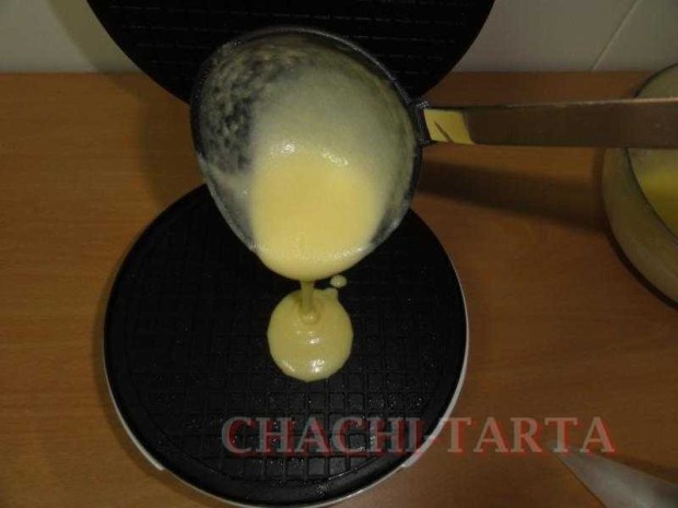 Llena con la mezcla un cucharón de los de sopa a la mitad, vierte en el centro de la barquillera y cierra la tapa haciendo presión para que se extienda por si sola, espera 1 o 2 minutos a que se haga el barquillo y retira.