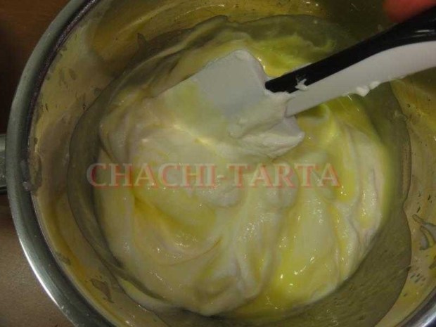 Por otra parte agrega los yogures (los que usé también son de la marca KAIKU) a la gelatina y mezcla para que se integren, luego incorpora poco a poco la nata montada removiendo cuidadosamente con ayuda de una espátula de cocina hasta que la mezcla se vea repartida homogéneamente.