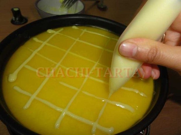 Reserva un poquito de esta mezcla en un cuenco pequeño y conserva a temperatura ambiente, rellena el molde con el resto de la mezcla sobre la base de galletas y conserva en la nevera durante al menos una hora para que éste cuaje.