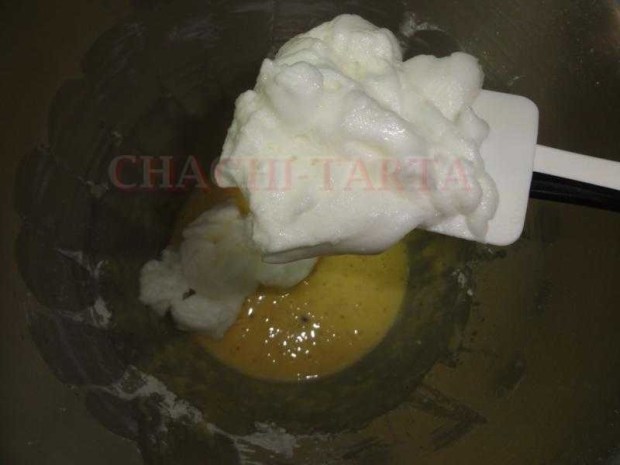 Monta las claras a punto de nieve muy fuerte y añade poco a poco a la mezcla anterior, removiendo con ayuda de una espátula con movimientos suaves para no bajarlas; la clave de un buen bizcocho genovés es que éste tenga suficiente aire para que quede suave y esponjoso.
