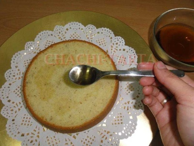 Como éstos bizcochos suelen ser un poquito secos, te recomiendo prepares un almíbar para «emborrachar» y que tenga una textura más agradable, para ello mezcla el agua con el licor de tu elección (en mi caso Marsala) y el azúcar blanca, ponlo en la sartén a fuego medio durante 8 a 10 minutos para que se evapore el alcohol y se diluya bien el azúcar y una vez frío procede a escurrir por ambas mitades del bizcocho.