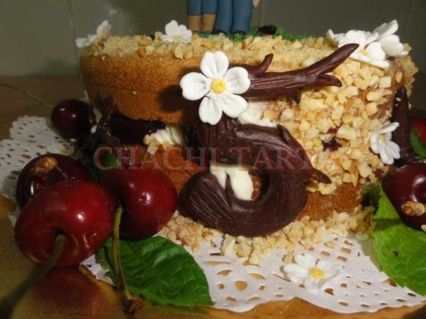 Además he cubierto parte de los bordes con almendra en cubitos y rematado la decoración con flores de cerezo hechas con fondant de azúcar y unas cerezas frescas que junto con unas hojitas de menta le han dado el toque final que buscaba.