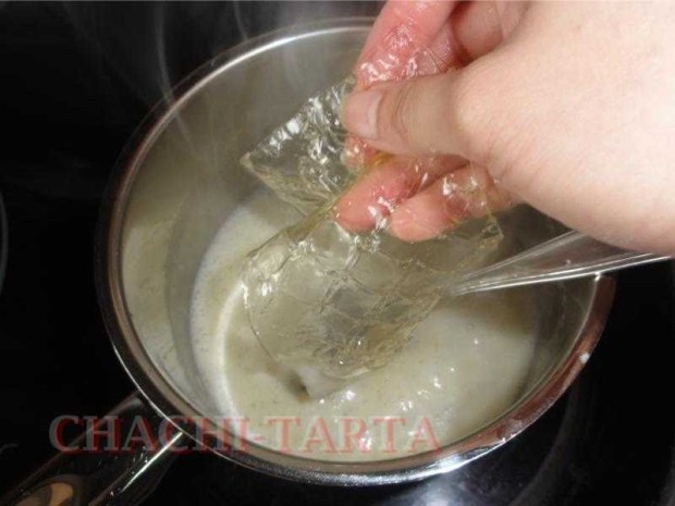 Pon a calentar 1/3 de la nata a fuego medio, hidrata la gelatina neutra en láminas en agua al ambiente, cuando comience a hervir la nata escurre las láminas de gelatina e incorpóralas removiendo hasta que se disuelvan por completo.