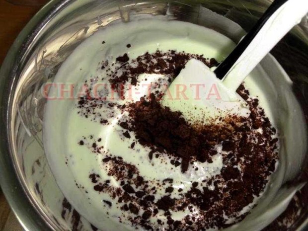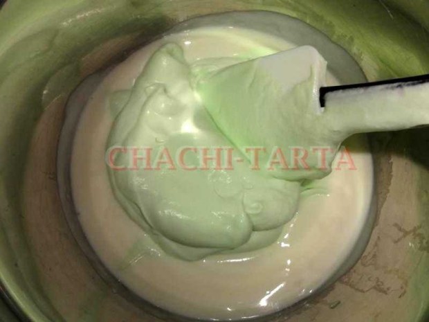 Añade los yogures, monta el resto de la nata con azúcar, aroma de crema de menta y el colorante verde para darle vistosidad e incorpórala poco a poco a la mezcla anterior removiendo con ayuda de una espátula.