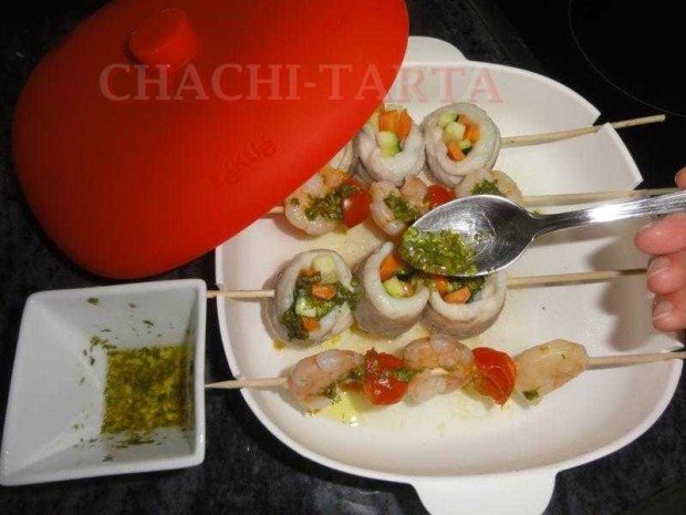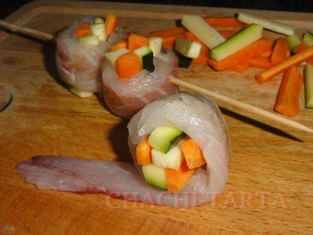 Coloca la verdura en uno de los extremos del filete, enrolla haciendo presión e insertando en el pincho de madera, atravesando la verdura de la parte central. En cada brocheta he colocado 3 rollitos de pescado.