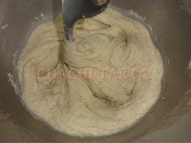 Por otra parte mezcla las harinas (trigo sarraceno, arroz y maíz) junto con la levadura seca, remueve todo para que quede distribuido uniformemente. Añade el aceite, el azúcar y la sal, por último incorpora poco a poco el almidón y amasa a la vez que agregas el resto del agua.