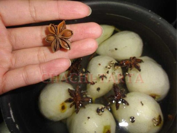 Pon a cocer las peras peladas en abundante agua a fuego medio-alto, agrega el azúcar, los granos de pimienta machacados y los anises estrellados.