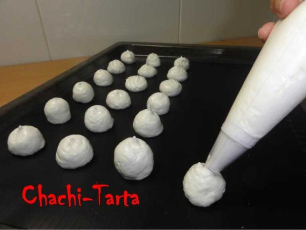 Para que queden mejor formadas, alisa con una cuchara ligeramente húmeda para aplastar los posibles picos que te hayan quedado al levantar la manga. Hornea a 100 grados durante 1 hora (horno precalentado), ¿porque tan bajita la temperatura?, para que se cocinen muy lentamente y no pierdan el color blanco.