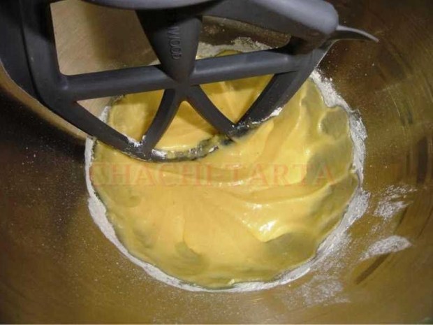 Mezcla primero los ingredientes húmedos: la mantequilla, los huevos, el yogur y el azúcar, añade además el aroma de vainilla, mezcla bien hasta que formes una crema lisa y homogénea. A continuación añade la mezcla tamizada de harinas (Schar Mix C y almidón dulce de mandioca) junto con la levadura.
