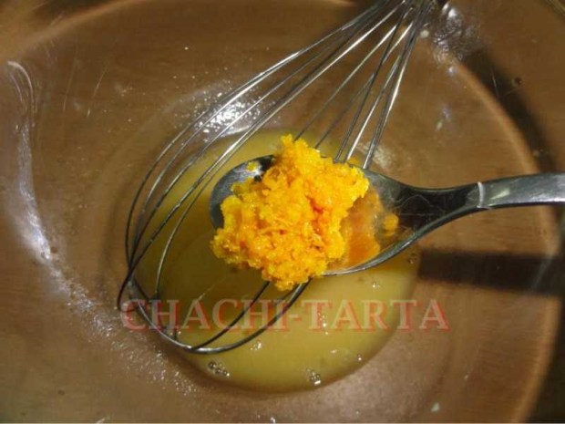 Funde la margarina en el microondas, añade el azúcar, el huevo y la ralladura de naranja, bate hasta que todo quede integrado y se forme una mezcla espumosa y muy aireada.