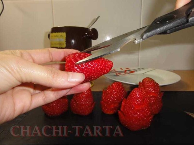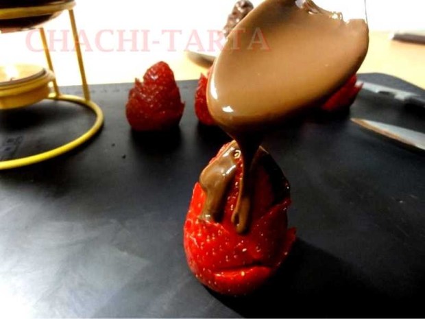 Su preparación es tan intuitiva que no tiene mucha explicación; funde el chocolate negro al baño maría o en una fuente fondúe, lava y corta las hojitas a las fresas y con unas tijeras de cocina haz unos cortes en todo el rededor de cada fresa.