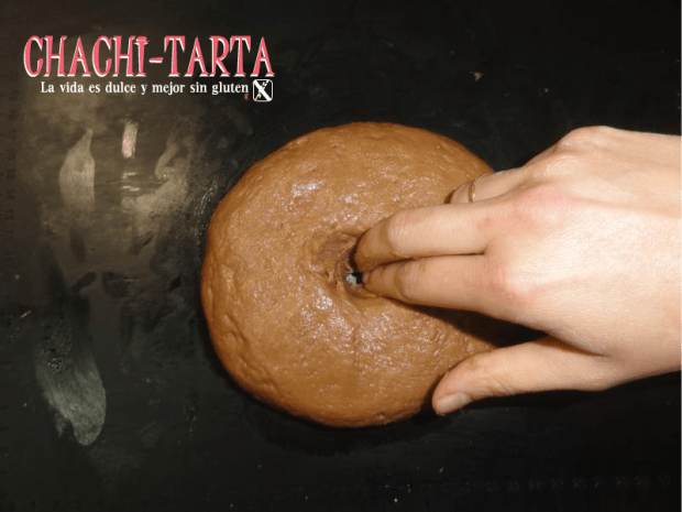 Formada la bola introduce los dedos por en medio ligeramente húmedos y estira poco a poco cuanto sea posible para ahuecar teniendo cuidado de no romper la masa.