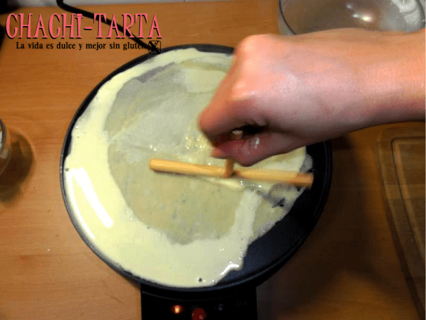 Una vez caliente la placa, toma la medida de un cuenco y vierte por el centro de la placa e inmediatamente extiende con ayuda del esparcidor haciendo movimientos circulares hasta recubrir toda la superficie. Pido perdón por mis fotos borrosas del proceso, es complicado hacerlas con una mano mientras intento cocinar con la otra jijiji