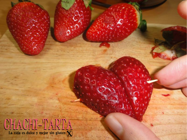 Su preparación es muy sencilla e intuitiva, primeramente lava bien las fresas, retira las hojitas y parte por mitades con un cuchillo; coloca ambas mitades con el corte hacia abajo y recorta un trocito a lo largo para que al juntar encajen mejor.