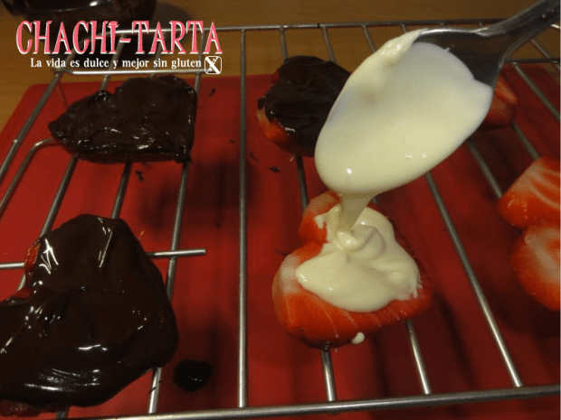 He cubierto 3 fresas con chocolate blanco y 3 con chocolate negro, con las cantidades que te sugiero salen aproximadamente 6 fresas pero todo depende del tamaño de las mismas. Deja que el chocolate endurezca, para ello coloca en la nevera durante unos 15 minutos.