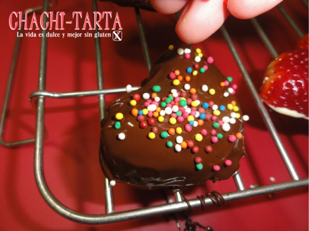Una vez endurecido, retira de la nevera, da la vuelta a las fresas y retira el palillo; nuevamente recubre la cara superior con más chocolate 🙂 y decora ya sea espolvoreando mostacillas o fideos de colores, o con lo que prefieras, incluso haciendo manchitas con chocolate.