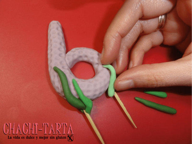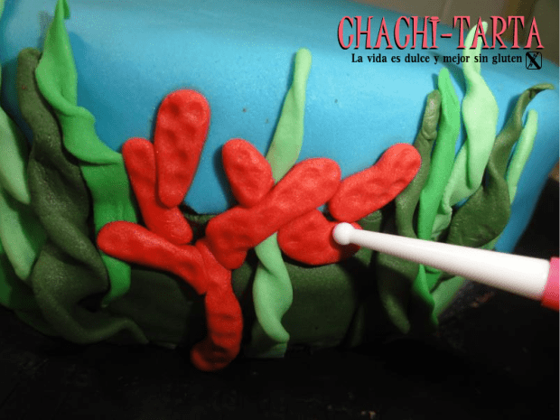Para darle un toque más realista y además cubrir algunas imperfecciones que pudieran quedar en la superficie de la cobertura, he colocado algunas plantas y corales de fondant sobre los bordes, de esta forma parece que la tarta cobra vida y se ve mucho mejor. Cada elemento ha sido elaborado a mano, sin plantillas ni moldes, únicamente con muuuucha paciencia.