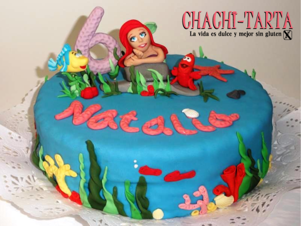 Cuando me encargaron esta tarta me emocioné mucho pues siempre me gustó la peli de la sirenita, tiene ya unos cuantos años en la historia del cine y la he visto muchas veces, la primera vez incluso era yo muy pequeña!, para recordar los detalles de los personajes he tenido que mirar muchos cortos de la peli, y me la he pasado como una enana 😀