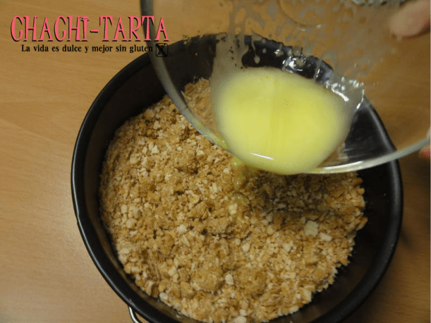 Tritura las galletas tipo María (yo usé de la marca Special Line – Sin gluten), y vuelca sobre el molde donde has de preparar la tarta, agrega la margarina derretida y mezcla hasta integrar. Aplasta hasta compactar la base de galletas ya sea con las yemas de los dedos o con ayuda de una cuchara.