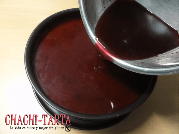 Para preparar la cobertura basta con calentar 1/2 vaso de agua y añadir 4 cucharadas de mermelada de arándanos y 2 láminas de gelatina previamente hidratada, mezclar bien hasta que se vea todo uniforme. Retira del fuego y espera durante al menos unos 15 minutos antes de verterlo por la superficie, si lo haces estando muy caliente corres el riesgo de que se derrita la capa anterior.