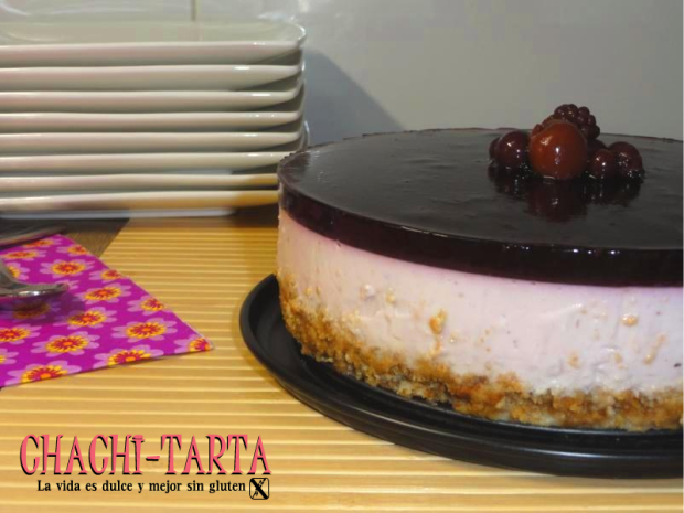 No hace falta encender el horno para preparar exquisitas tartas y postres, como tampoco hace falta esperar al verano para disfrutarlos 🙂 así que por eso hoy me he animado a elaborar esta sencillísima pero sabrosísima tarta de yogur con mermelada de arándanos, completamente libre de gluten y de lactosa, como nos ha encantado!!