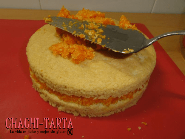 Corta el bizcocho en mitades una vez que esté completamente frío, rellena con la pasta de coco y zanahorias y unta también por toda la superficie hasta cubrir.
