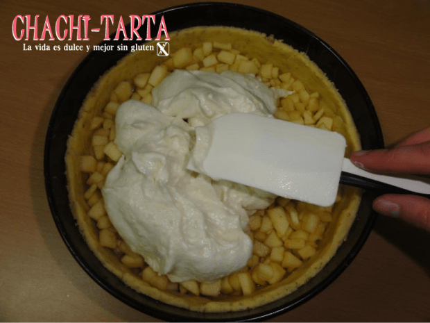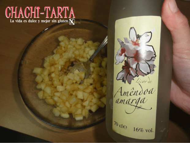 Mezcla 2 cucharadas de azúcar (la cantidad depende del dulzor de la manzana) y añade licor de almendras, ninguno de estos licores suele contener gluten. Vuelca el contenido sobre el molde con la pasta y reserva.