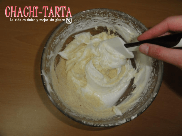 Procede finalmente a montar las claras a punto de nieve, añadiendo poco a poco el azúcar glacé tamizada hasta que blanquee y se forme el merengue; hasta entonces incorpora la almendra molida y con ayuda de una espátula mezcla cuidadosamente hasta integrar.