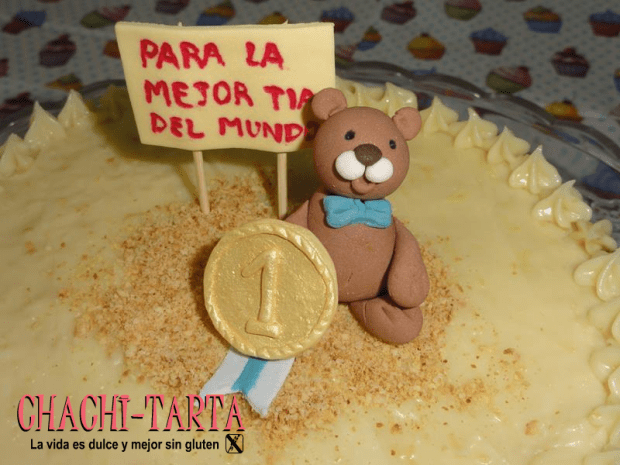 Puesto que es para dedicarla a mi cuñada he hecho la dedicatoria utilizando fondant de azúcar (la marca KELMY es sin gluten), un osito muy tierno, del cual he hecho un pequeño tutorial que le otorga la medalla a la mejor tía del mundo mundial 😀
