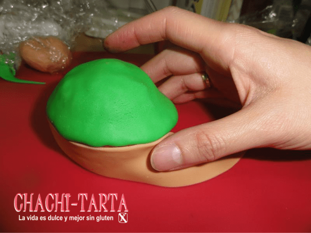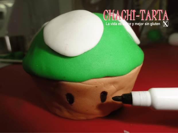 Empezamos pintando el fondant de los colores que necesitemos, para ello he utilizado colorantes comestibles en gel de la marca Sugarflair (sin gluten), como ya comentaba antes he comenzado por modelar las figuritas y para decorar las setas-cupcake he pintado fondant de color verde y marrón claro.