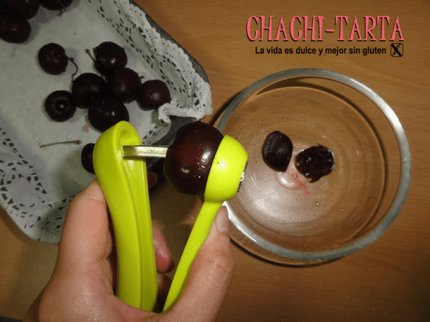 Deja reposar la masa durante unos 15 a 20 minutos y mientras tanto calienta el horno a 170 grados, además aprovecha a descorazonar las cerezas; puedes hacerlo con ayuda de un cuchillo aunque también hay utensilios que te lo ponen mas fácil, como el que se ve en la foto; los hay mejores he de decir que este me costó nada más que 3 euros en la tienda CASA, pero bueno al final es para lo que es y funciona.