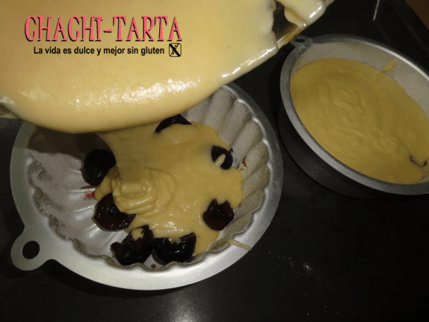 Una vez engrasados y enharinados los moldes, coloca las cerezas en el fondo y rellena con la masa del bizcocho hasta la mitad, hornea durante unos 25 a 30 minutos hasta que veas que por la superficie han tomado color.